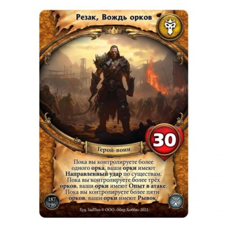 Резак — свирепый вождь орочьих кланов, привыкший к набегам и сражениям. Его армия делает ставку на силу, давление и агрессивную тактику. Такой стиль игры подойдёт тем, кто предпочитает быстро навязывать бой и подавлять противника за счёт мощных существ и постоянного давления.