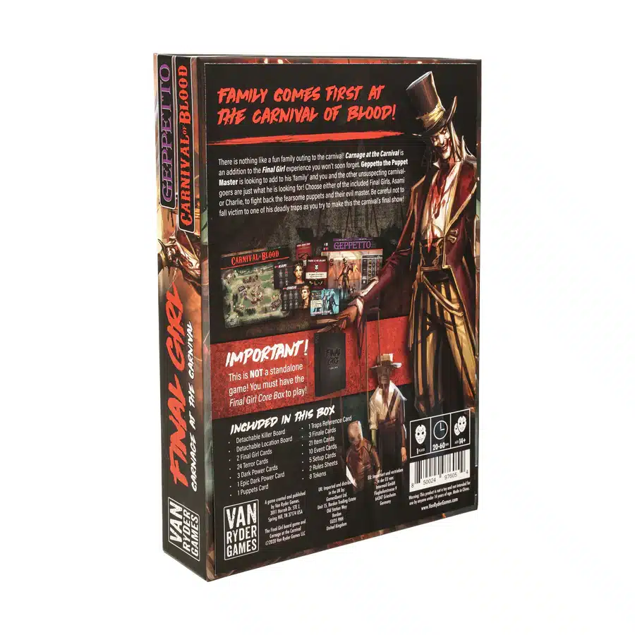 Final Girl: Series 1 — Carnage at the Carnival Feature Film Expansion — это сценарное дополнение к базовой игре Final Girl, которое переносит ужасы в карнавальный парк, где маньяк устраивает кровавую мясорубку. Игрок должен управлять выжившей, спасать других и найти способ остановить убийцу, прежде чем выставка превратится в кошмар.