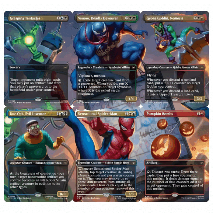 6 сценических карт, которые соединяются в эффектную сцену с Человеком-пауком, Веномом, Зелёным гоблином и Доктором Октавиусом.
