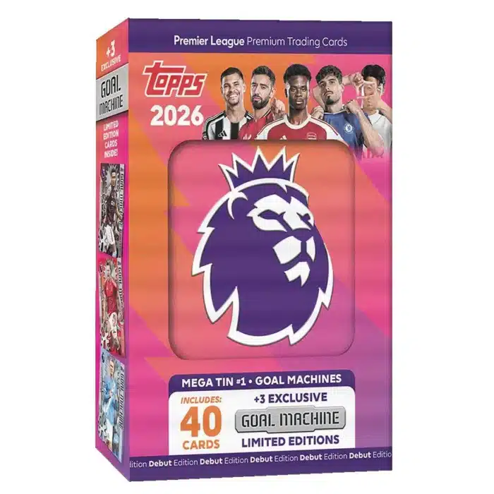 Topps Premier League 2026 – Edizione Debutto – Mega Tin (Goal Machines) — это специальный металлический бокс (Mega Tin) с коллекционными карточками футбольной серии Topps Premier League 2026, включающими наборы карточек по теме Goal Machines — игроков-бомбардиров.