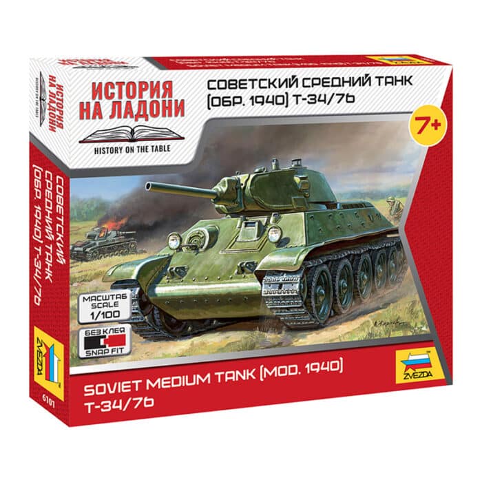 Сборная модель советского среднего танка Т‑34/76 (мод. 1942 г.) от компании Zvezda — пластиковый набор для самостоятельной сборки одной из самых узнаваемых машин Второй мировой войны. Танки Т‑34/76 отличались технической простотой, высокой подвижностью и сильной лобовой броней, что делало их грозной силой на фронтах Великой Отечественной войны.