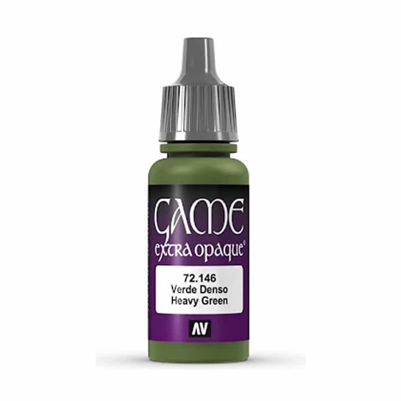 Vallejo Game Color Heavy Green — акриловая краска (серия Extra Opaque) для кистевой и аэрографной окраски миниатюр и моделей, разработанная для получения насыщенного тёмно‑зеленого цвета с отличной матовой укрывистостью. Оттенок Heavy Green представляет собой глубокий естественный зеленый тон, который идеально подходит для базовых слоёв, ткани, брони, растительности, щитов и декоративных элементов на фантастических и военных моделях.