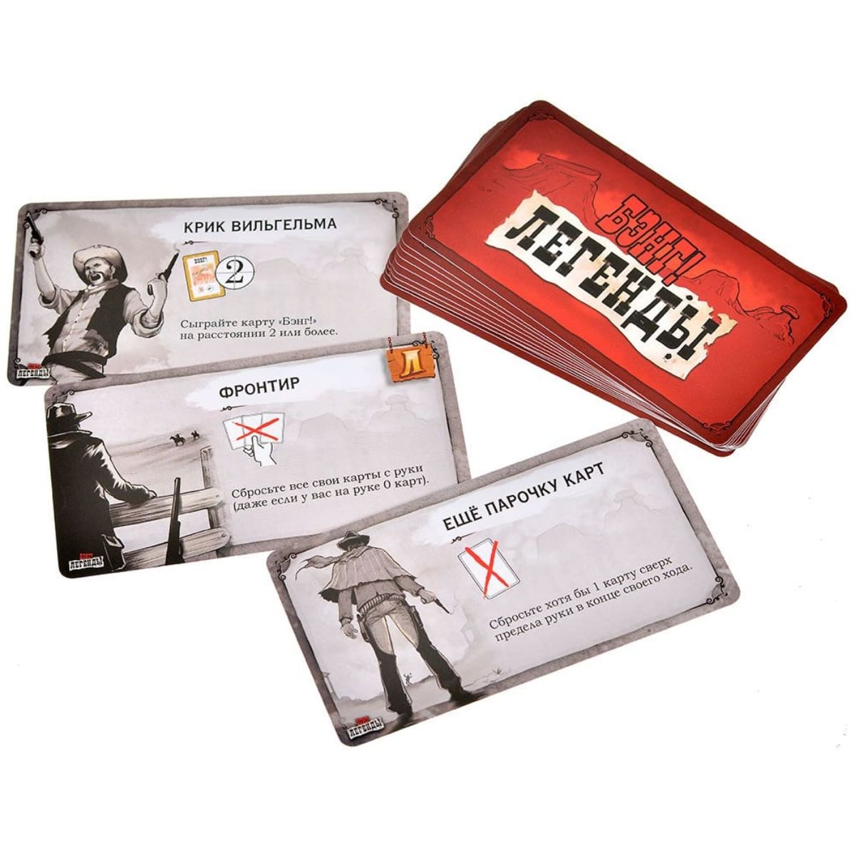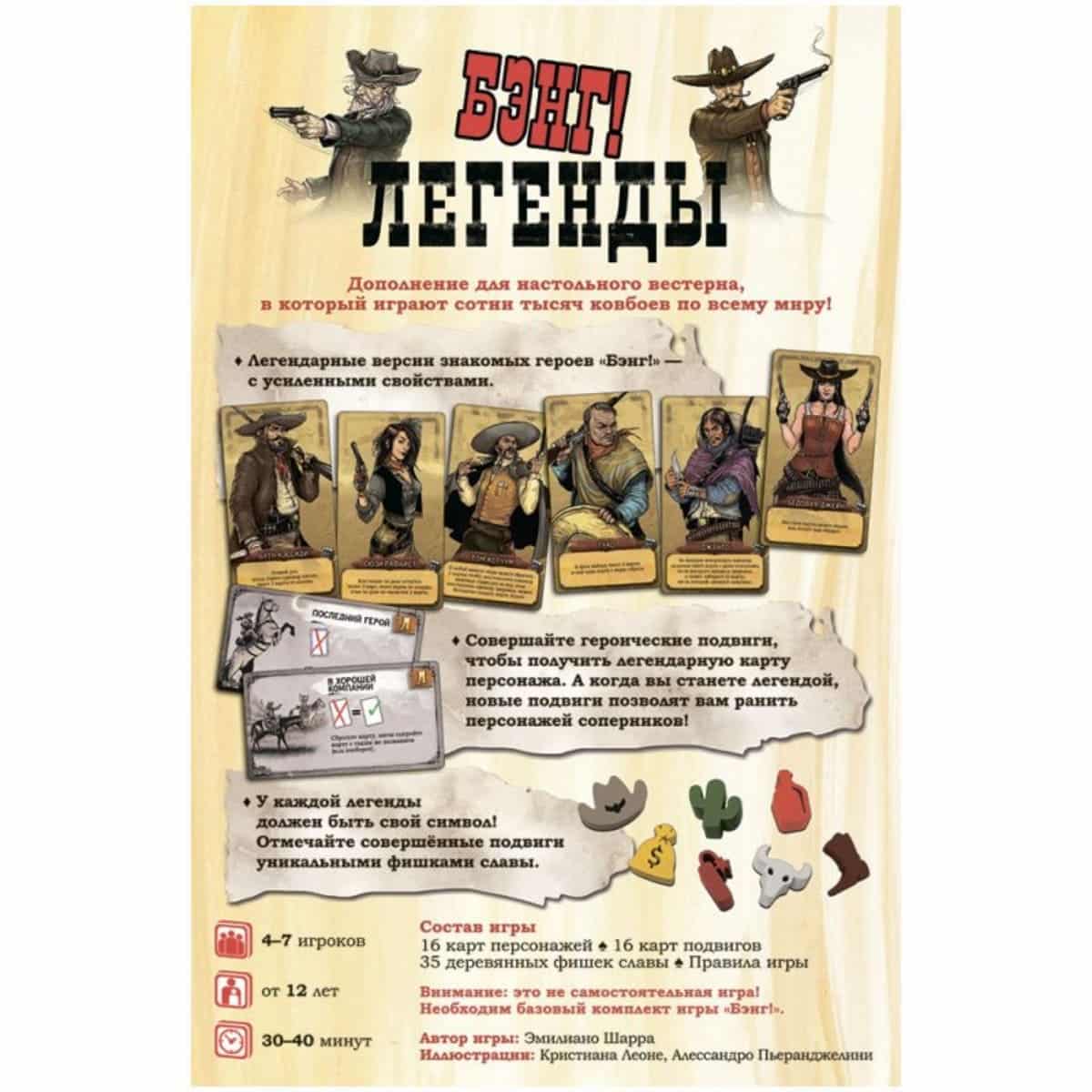 Дополнение включает 16 карт легендарных персонажей, 16 карт подвигов и 35 деревянных жетонов славы в различных формах и цветах, что увеличивает вариативность партий и позволяет игрокам применять новые тактики и подходы. Это дополнение идеально подходит для тех, кто любит оригинальный BANG! и хочет добавить в игру новые стратегии, цели и ощущения эпичного вестерна, где легендарные герои становятся ещё могущественнее.