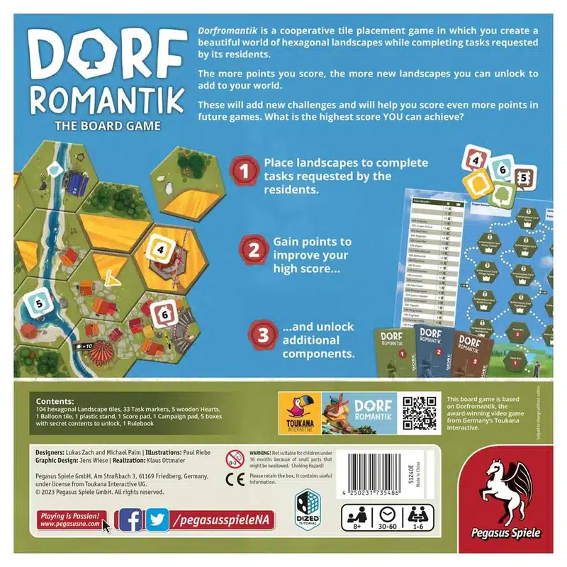 Dorfromantik: The Board Game — кооперативная настольная игра, в которой игроки совместно создают красивый сельский ландшафт из шестиугольных тайлов, выполняют задания жителей и стараются набрать как можно больше очков. Игра основана на одноимённой видеоигре и сочетает спокойный игровой процесс с системой кампании, где постепенно открываются новые компоненты и задания.