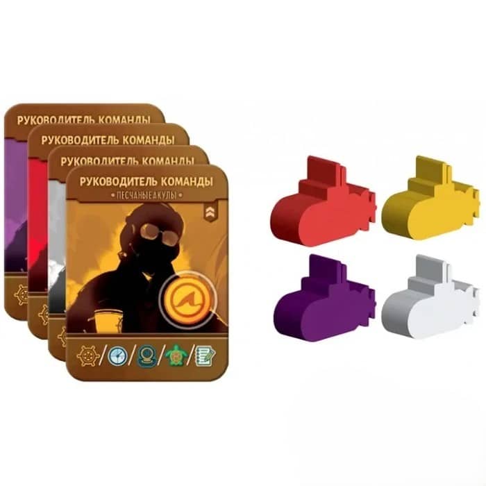 Коробка содержит разнообразные компоненты, включая планшеты океана, планшеты игроков, жетоны специалистов и погружений, субмарины, листы миссий и заметки, а также большое количество игровых маркеров для подсчёта влияния и выполнения условий миссий.