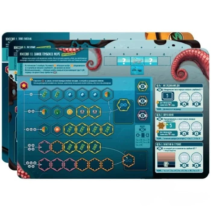 «Экспедиция. Морские глубины» — это самостоятельная стратегическая настольная игра о подводных исследованиях, где игроки становятся руководителями независимых исследовательских институтов, изучают океанские глубины, нанимают специалистов и выполняют миссии в условиях меняющихся задач и уникальных локаций.