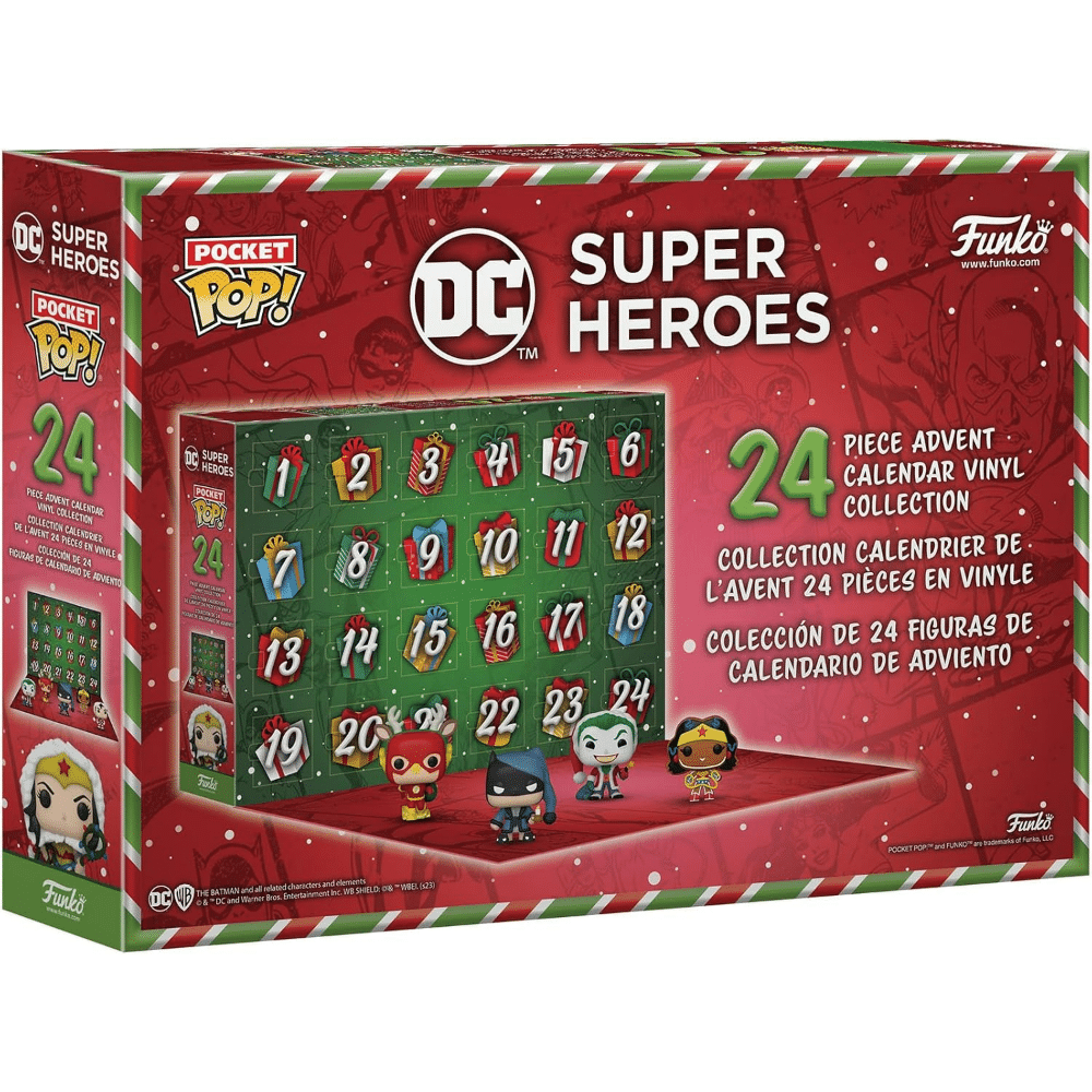 Funko Pop! Advent Calendar: DC Super Heroes — адвент-календарь с мини-фигурками и аксессуарами по героям вселенной DC, оформленный в стиле Funko POP для праздничного обратного отсчёта.