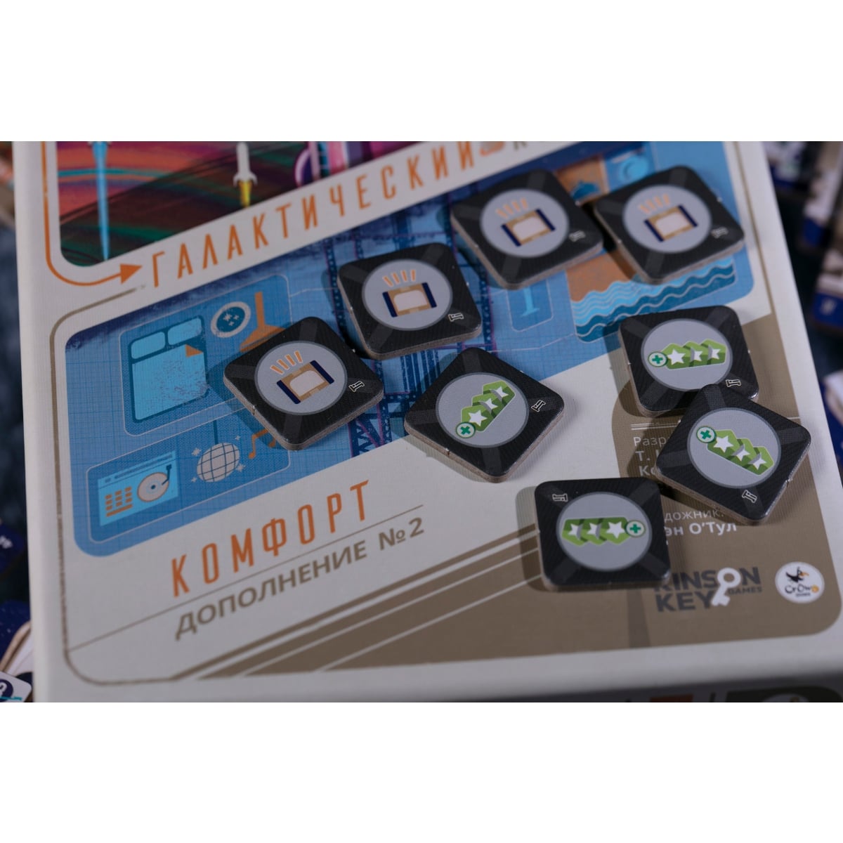 «Галактический круиз. Комфорт» — это модульное дополнение к основной игре Galactic Cruise 2025 года, которое добавляет новые стратегические возможности, карты и жетоны, расширяя базовый опыт управления космической туристической компанией. Дополнение включает 39 карт и множество жетонов (чертежей, технологий, специалистов, улучшений), которые можно использовать отдельно или в сочетании с другими модулями, чтобы разнообразить и углубить игровой процесс, а для новичков оно создаёт более мягкий старт и гибкие варианты развития. В сочетании с основой оно увеличивает глубину тактики и выборов, позволяя игрокам строить корабли, нанимать персонал, развивать технологии и очковать за создание комфортных круизов, причём каждое дополнение влияет на темп и стратегические решения, делая партии более насыщенными и вариативными.