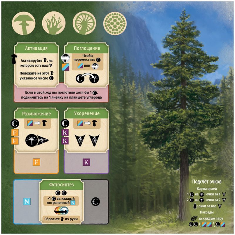 По мере появления новых грибов расширяются возможности игроков по преобразованию ресурсов и созданию выгодных связей, а ключ к победе — занять наиболее эффективные позиции и оптимально использовать доступные действия. Игроки строят общий лес, взаимодействуют с грибами, получают ресурсы через партнёрства и размещают саженцы так, чтобы получить максимальное количество очков.