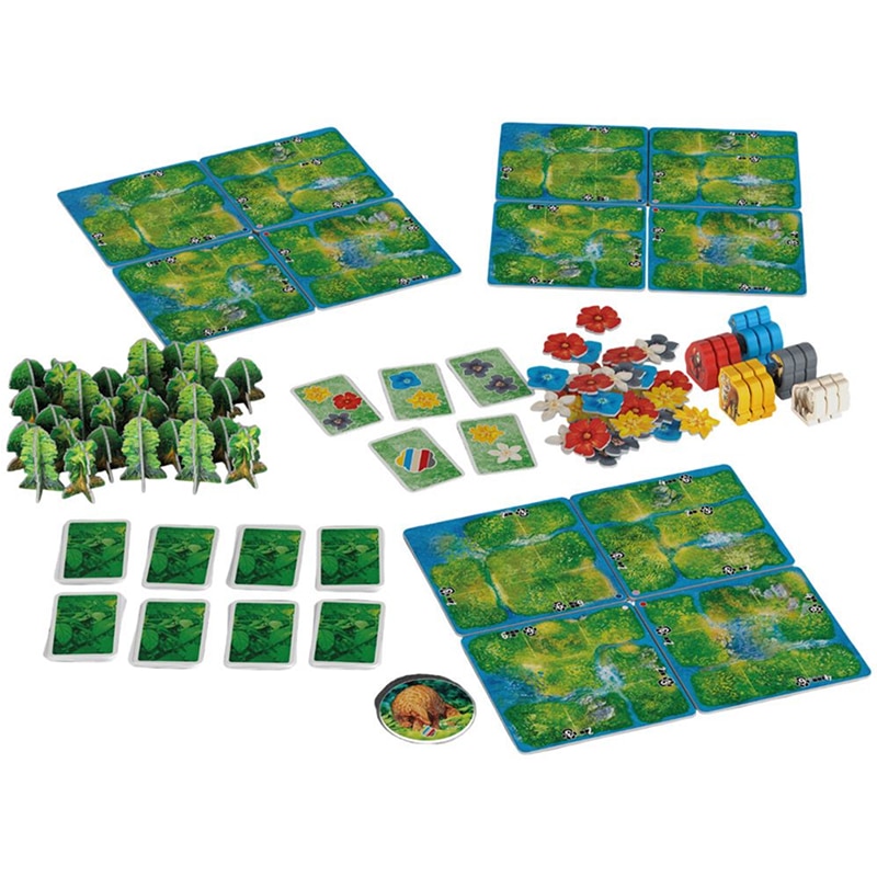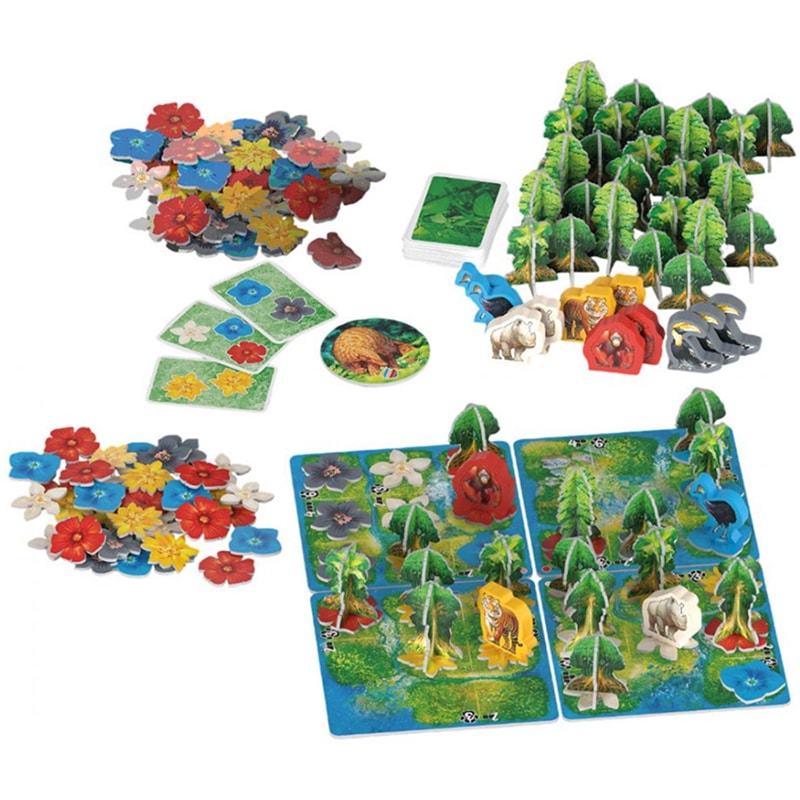 Игроки берут карты с рынка и размещают их на своих планшетах, постепенно формируя уникальный дождевой лес. Разноцветные цветы превращаются в деревья, а затем привлекают животных в соответствующие зоны. Важно стратегически планировать размещение, чтобы создать гармоничную и прибыльную среду, поскольку комбинации растений и животных дают разные очки в конце игры.