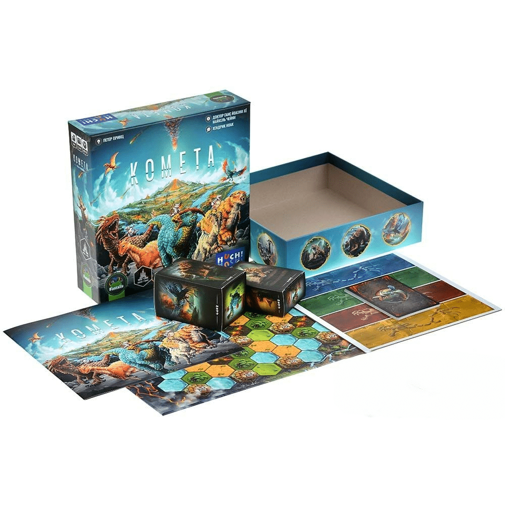 Комета — семейная настольная игра о спасении доисторических животных перед надвигающейся катастрофой. Игроки управляют разными видами существ, стараясь провести их в безопасные зоны раньше соперников, используя тактику, тайминг и немного хитрости.