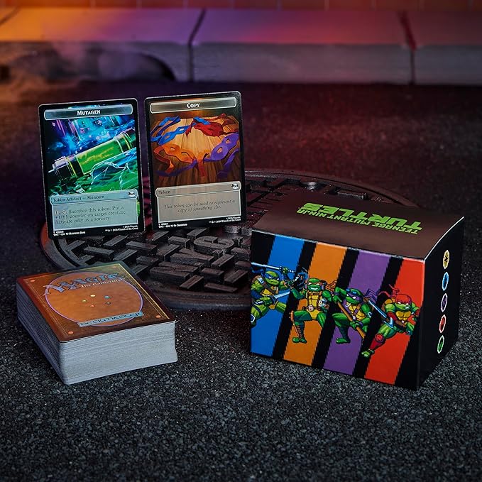Внутри находится полноценная колода из 100 карт, включая 43 новые карты, созданные специально для этого выпуска, а также токены, коробка для хранения и вспомогательные материалы. Это отличный вариант как для фанатов TMNT, так и для игроков, которые хотят начать играть в Commander без сборки колоды с нуля.