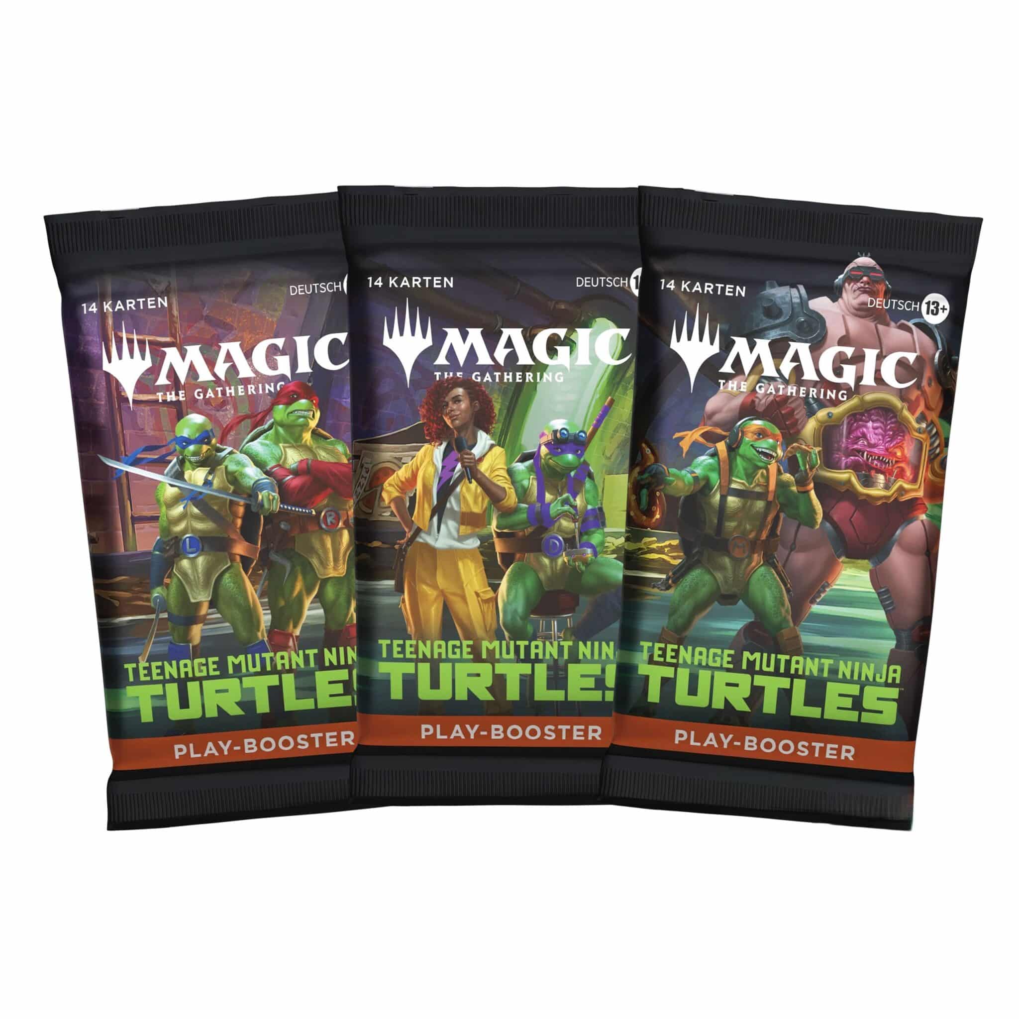 Teenage Mutant Ninja Turtles — Play Booster — это основной тип бустера, предназначенный как для игры (драфт, sealed), так и для обычного открытия. В каждом бустере содержится 14 карт, включая комбинацию common, uncommon и несколько карт редкости Rare/Mythic, а также минимум одну фойловую карту.