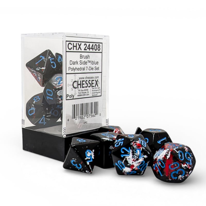 Chessex Brush Dark Side — набор из 7 полигональных кубиков в тёмном дизайне с синими цифрами. Отличный выбор для настольных RPG, включая Dungeons & Dragons.