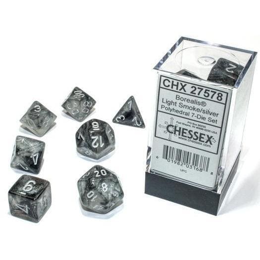 Chessex Borealis Light Smoke/Silver Luminary Polyhedral 7-Die Set — это комплект из семи игровых кубиков от производителя Chessex, предназначенный для настольных и ролевых игр, таких как Dungeons & Dragons, Pathfinder и другие RPG-системы. Кубики изготовлены из прочного пластика и выполнены в цвете Light Smoke (светло-дымчатый, полупрозрачный) серии Borealis, с внутренними переливами и мягкой текстурой. Контрастные серебряные цифры обеспечивают удобное считывание значений на всех гранях. Серия Luminary означает, что материал кубиков способен накоплять свет и слабо светиться в темноте после воздействия яркого света (солнечного или лампового). Это не подсветка — это эффект накопления света самим пластиком.