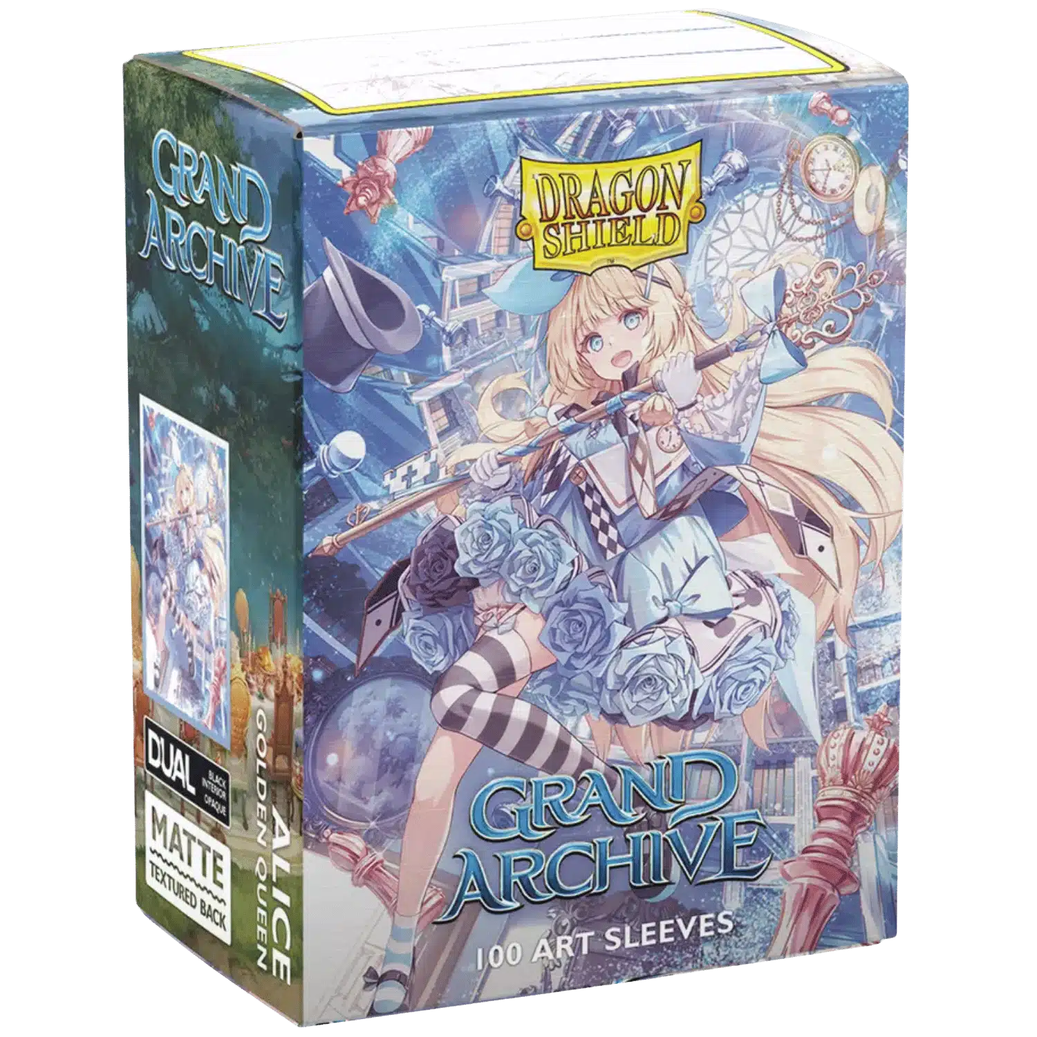 Серия Matte Dual Art отличается двойной конструкцией: внешний слой украшен детализированным артом Alice, а внутренний чёрный непрозрачный слой полностью блокирует просвечивание карт, обеспечивая одинаковый внешний вид всей колоды. Матовая поверхность уменьшает блики при освещении и делает перемешивание карт плавным и удобным. В упаковке содержится 100 протекторов, чего достаточно для стандартной игровой колоды.