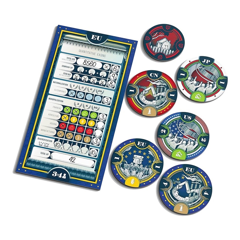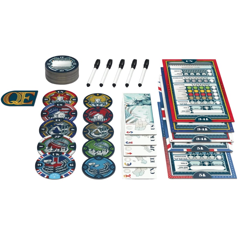 QE — это экономическая аукционная настольная игра, в которой 3–5 игроков выступают в роли центральных банков своих стран во время финансового кризиса. Ваша цель — спасать компании, делая ставки на их выкуп, но с уникальным поворотом: вы можете печатать неограниченное количество денег, однако тот, кто потратит больше всех, автоматически проигрывает. Игра сочетает стратегию, скрытые ставки и сбор сетов компаний для получения победных очков.