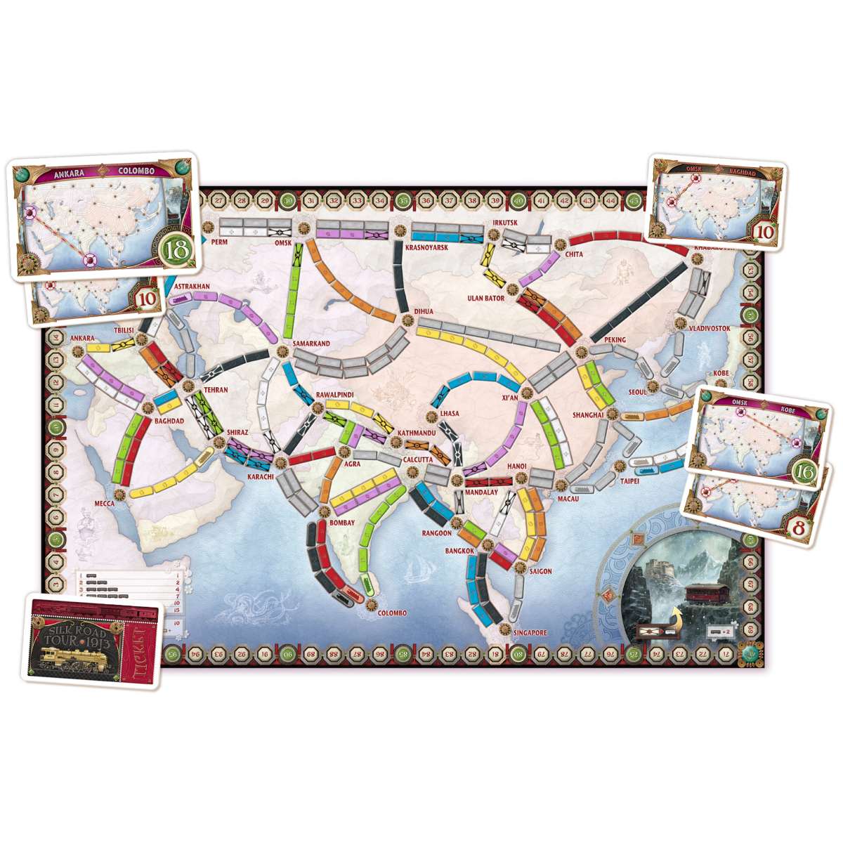 В коробке также представлена карта Legendary Asia для классической игры без команд. Она отличается более сложной географией и требует более продуманного планирования маршрутов и ресурсов. Игроки по-прежнему собирают карты вагонов, занимают пути между городами и выполняют задания, стараясь набрать как можно больше очков, но из-за новых условий игра ощущается более напряжённой и вариативной.